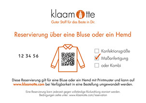 Mit einer aktivierten Reservierung hast Du Anrecht auf die Bestellung und den kostenfreien Bezug einer Bluse oder eines Hemdes mit Printmuster in einer angebotenen Konfektionsgröße oder als Maßanfertigung.